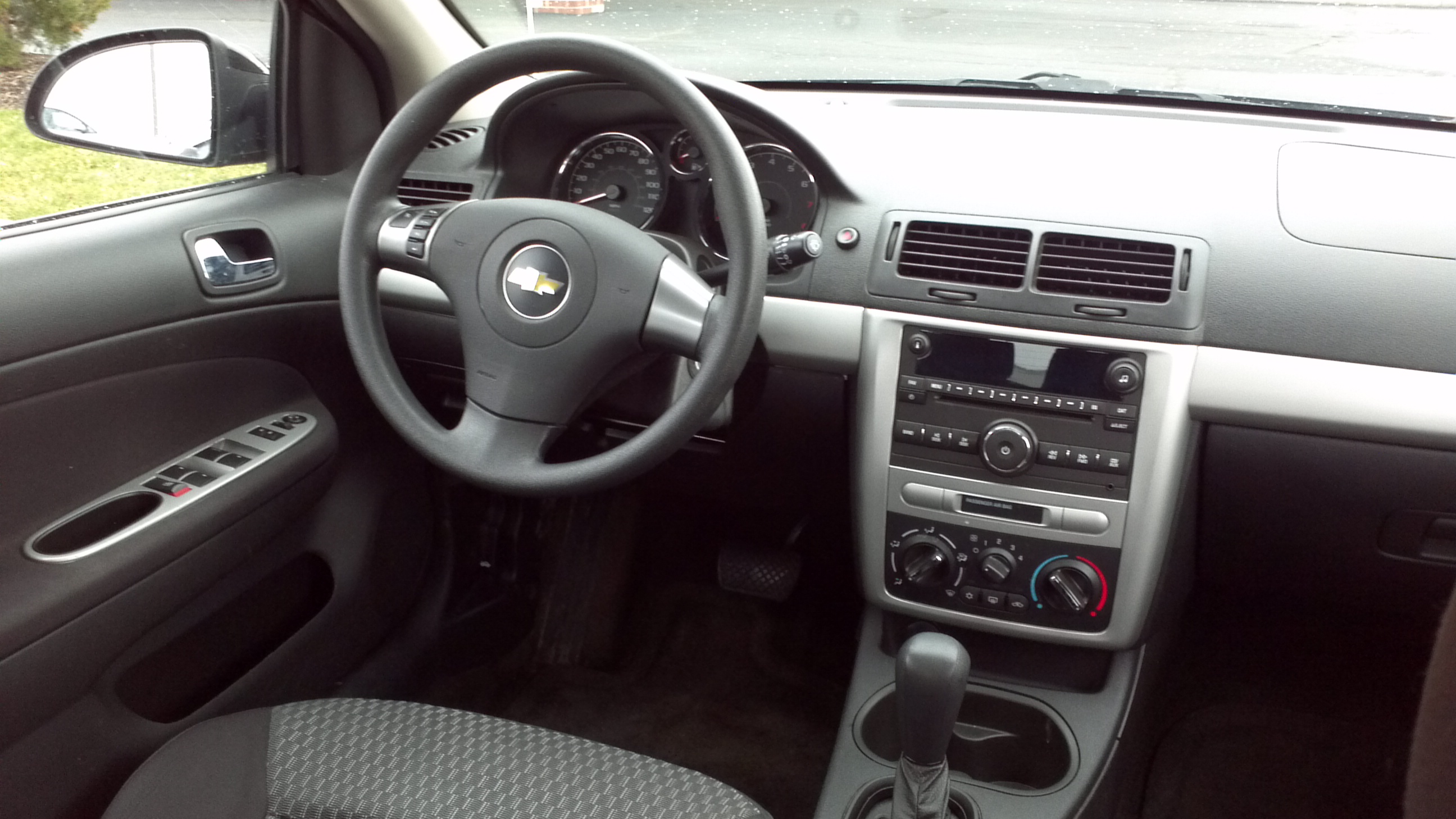 Inside is where the Cobalt shows its age, and workmanship of the old GM shines through. The cabin is logically laid out and all of the controls make sense. The radio is the standard GM unit used in most of its models during the last half of the decade- which means it’s user friendly and has one of my favorite features- a large volume knob smack dab in the middle. Ventilation controls were the simple and effective three knob setup, and the gauges are large, round, and intuitive. There’s little too fault on the ergonomics. However, most of the surfaces are swathed in cheap, dark, hard plastics. Silver accents run the width of the car between the door panels to break up the monotony, but the quality overall is low and inconsistant. The cupholders pop out of the place in the console much too easily and the center armrest was flimsy. These are the details GM used to notoriously cut corners on. It’s still better than the old Cavalier but didn’t compare to
