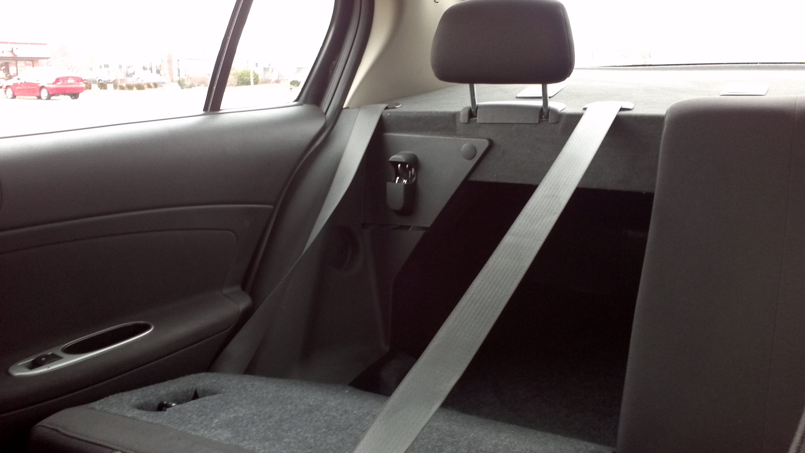 The Cobalt is full of cost-cutting contradictions. As mentioned, the trunk lid is attached with pricier gas struts, yet the inside of the lid is exposed bare metal. There’s no liner, which exposes sharp edges. The hood is also lifted with a gas strut, one of the last non-luxury cars I’ve seen with this convenient feature, but the side mirrors do not fold- which could lead to avoidable expensive body repairs. The temperature gauge was omitted as well, replaced by a warning light if the engine overheats, which could be too late at that point. Lastly, the back seat exhibits a creative idea- the rear headrests are planted on the back parcel shelf instead of the seats themselves. This is the only car I’ve ever seen with this feature and