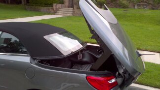 The trunk is extremely roomy with 13 cu. ft while the top is up and the liftover is low. The hinges are part of the convertible mechanism and are out-of-the-way for easy loading. Once the top is down, space is cut by more than half and there’s only room for one carry-on item.