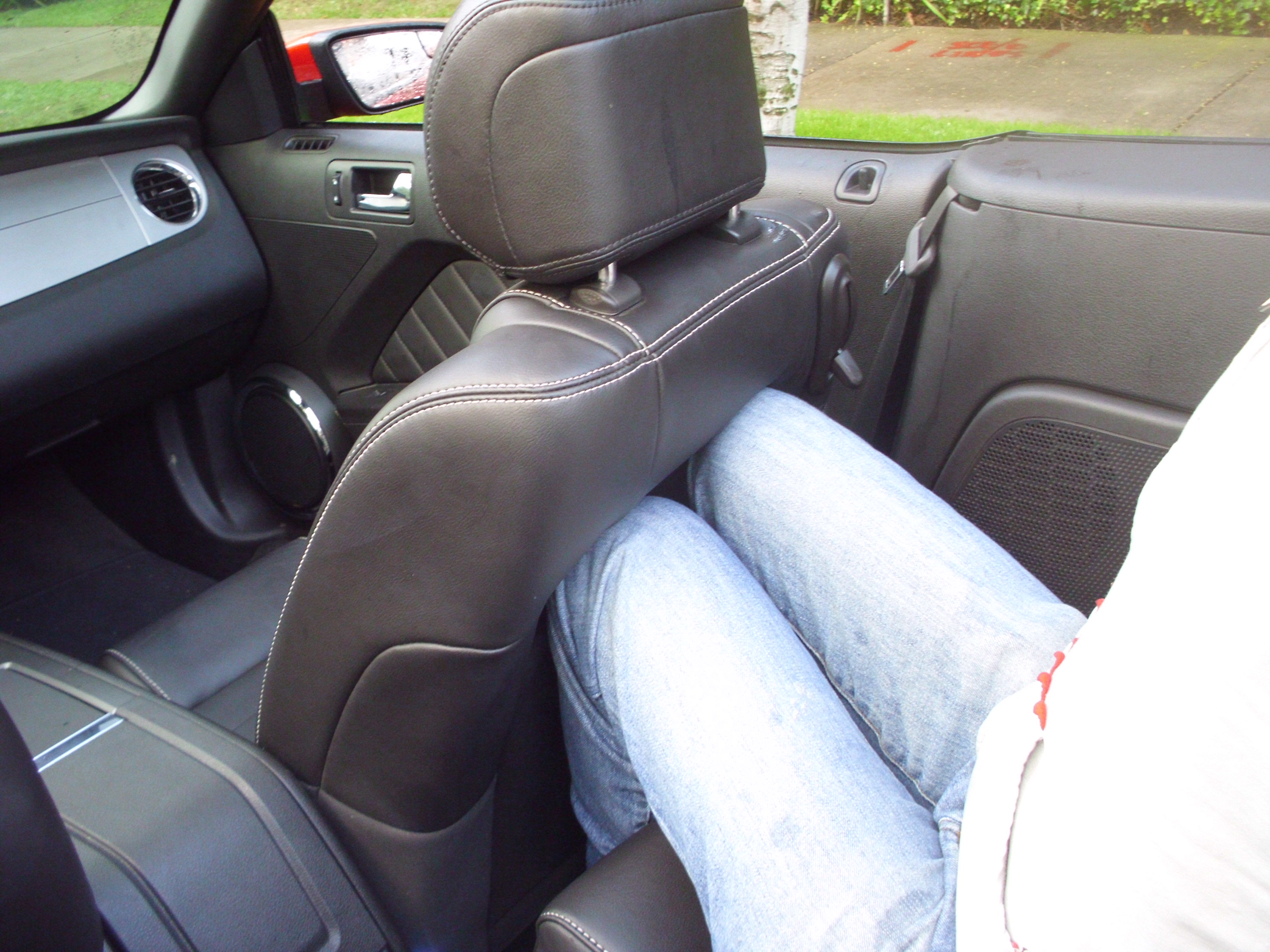 Mustang can carry four in a pinch, but depending on the length of the trip, passengers may not want to talk to each other afterwards. Up front there’s decent headroom and legroom even though the seating position is low and knees are forced skyward. Seat bottoms are flat and very firm, causing some aches after longer trips, yet the side bolstering is contoured well and holds passengers in comfortably, especially during cornering.