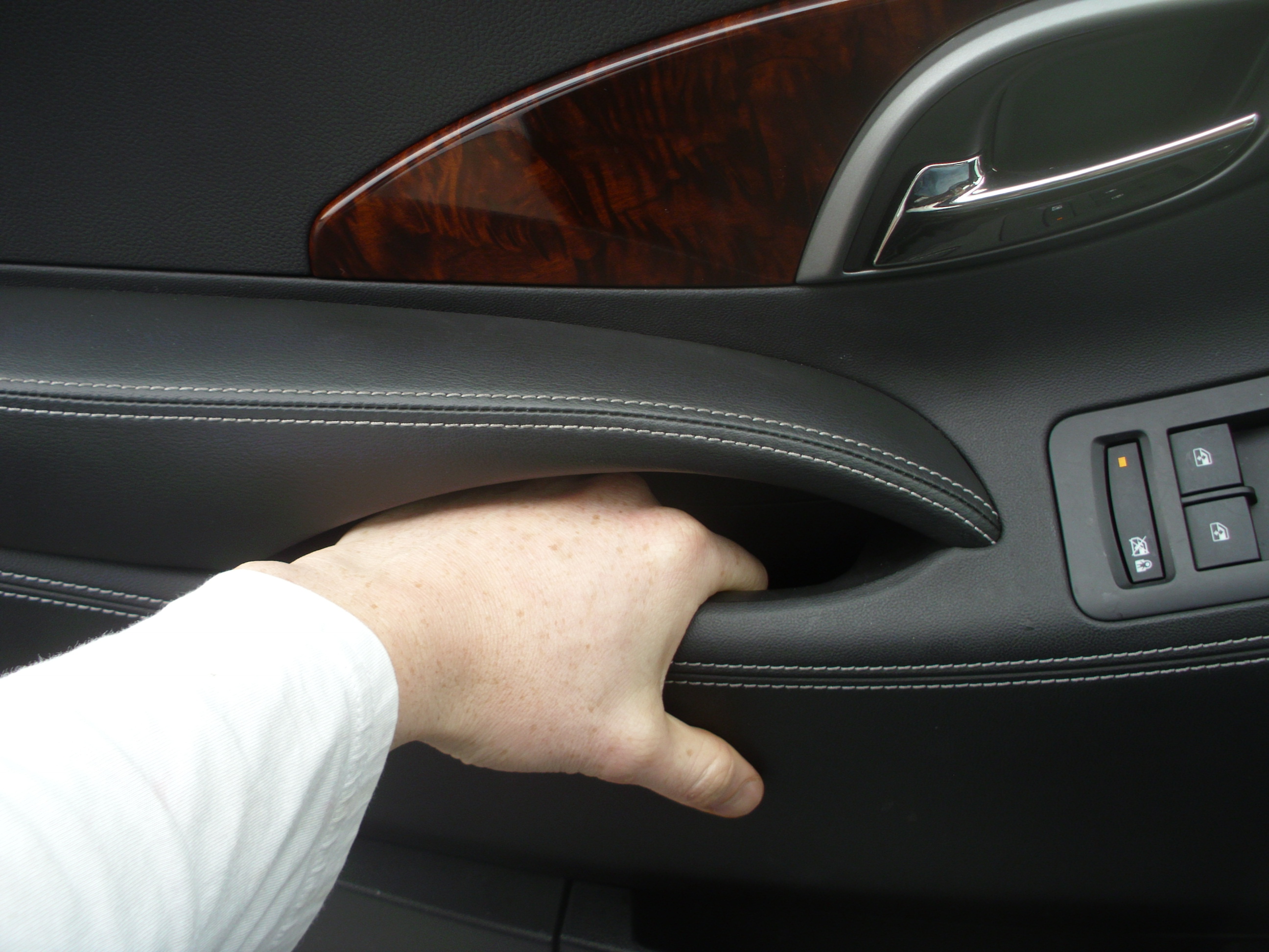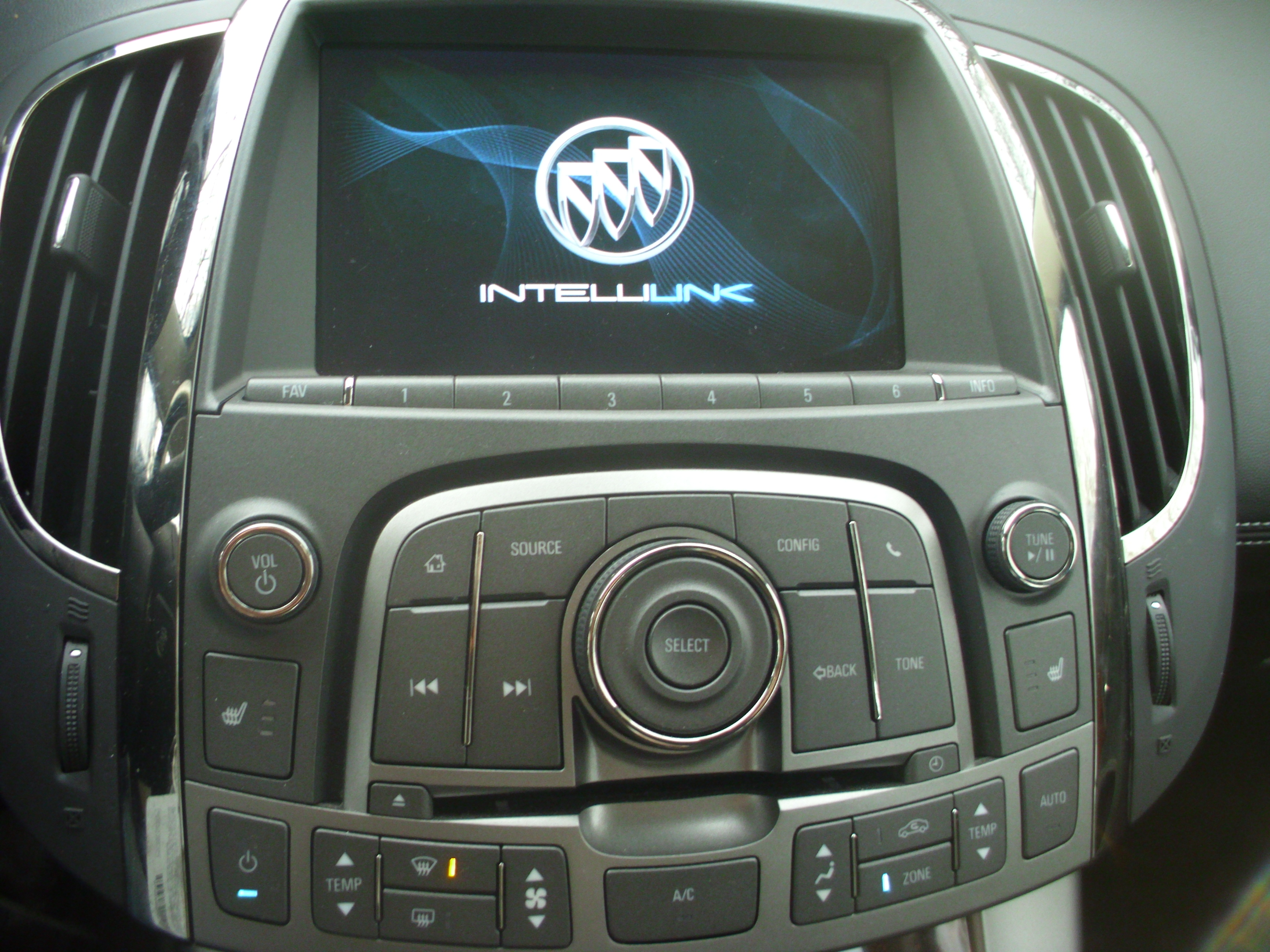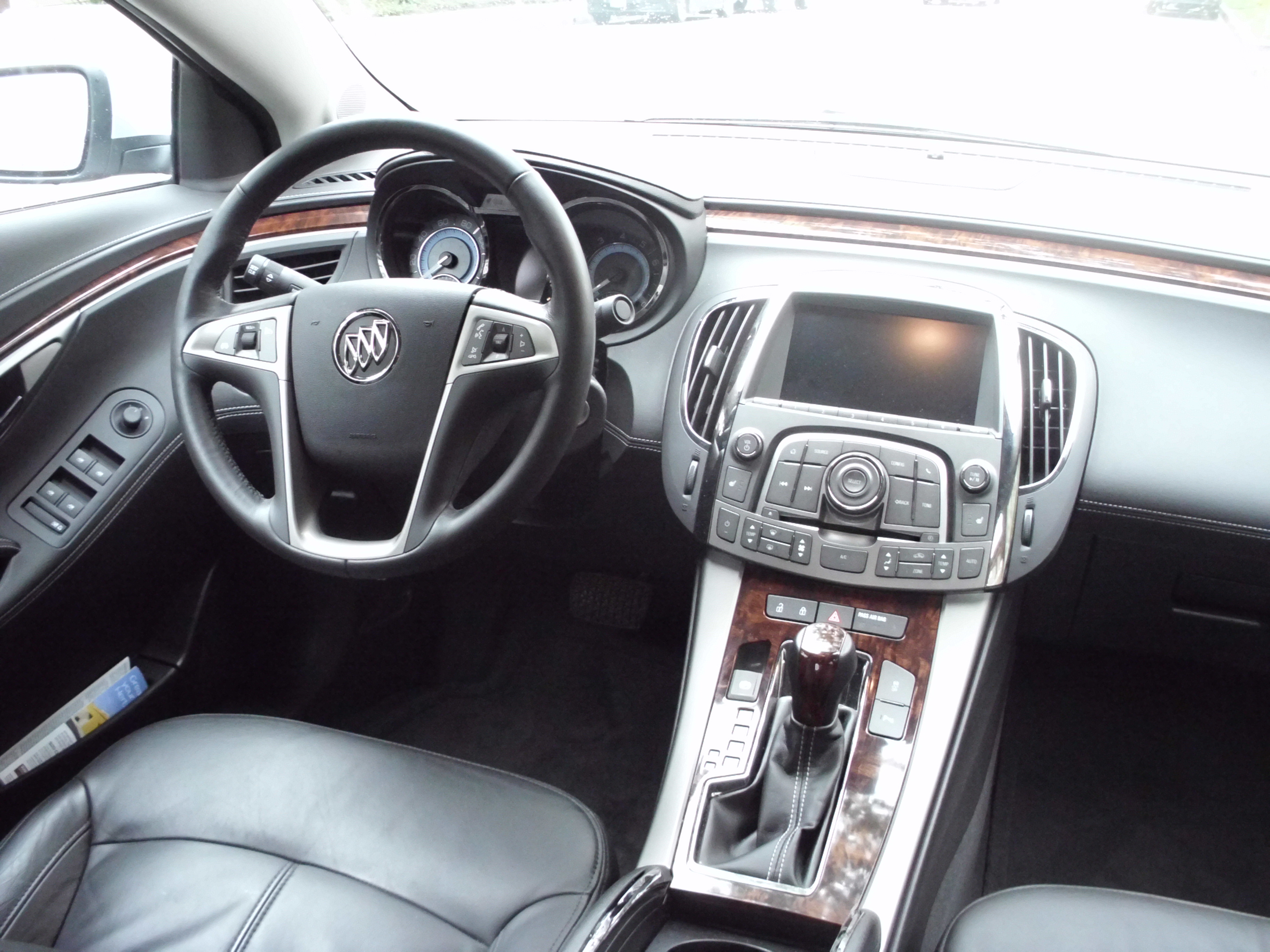 DSCI1120The radio and ventilation controls can be daunting at first.  There’s no less than 35 buttons on the dash and they appear to be a complete clutter initially.  But as time goes by, it becomes natural to decipher them and they do eventually make sense.  The dual climate control is effective.  On that note, one strange issue we kept having was the passenger side windshield would continually fog-up while the driver’s side would DSCI1126be perfectly clear, even if there wasn’t a body on that side of the car and the entire windshield was set to defrost.  I’m not sure if this is a common LaCrosse issue or just a phenomenon on our particular car.  Most radio adjustments can be done through the large entertainment screen, which is touted as “Buick Intellilink”.  Intellilink is touch screen and offers some pretty high-resolution graphics.  It is much more user-friendly than Ford MyTouch and the basic radio  controls are easy.  However, like MyTouch, making more involved setting adjustments on the radio, such as bass or fade, requires going through a series of menus and requires way too much driver attention from the road.  On a random note, like may BMW’s and Mercedes today, the LaCrosse offers an electronic parking brake that is basically a button on the console. Personally, as an avid parking brake user, this setup actually caused me to forget to use it several times, and I still don’t completely trust it if there are ever any electronic gremlins or a dead battery.  Otherwise, the LaCrosse’s interior is easy to learn and intuitive.DSCI1142