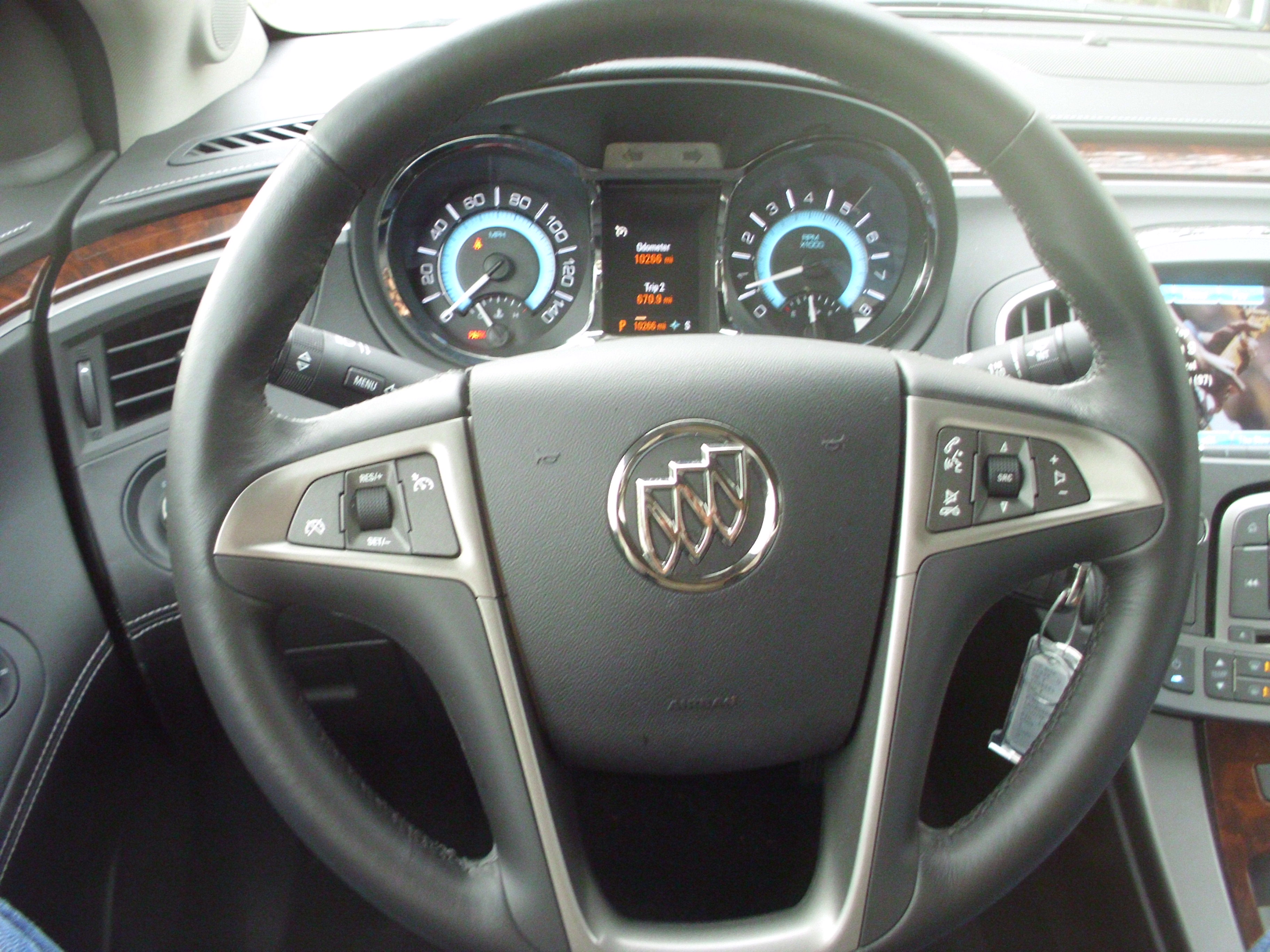 The three spoke steering wheel has meaty grips and the leather trim is expertly applied to the rim.  The wheel does tilt and telescope and frames a small pod which houses the gauges.  I give Buick credit for retaining a traditional fuel and temperature gauge and the information screen displays the car’s stats and monitoring systems.  The left steering column stalk that controls the menusDSCI1146 for the screen is easy to use as well.  Typically large numbers are a good thing on a speedometer, however the ones on the LaCrosse’s instrument gauges are almost too big, and in contrast to the small markers, it’s difficult to determine at a glance exactly what speed the car is going.  However, the center information screen also has the option of a digital speedometer (complete with attractive colors and gradients) to offset that issue.