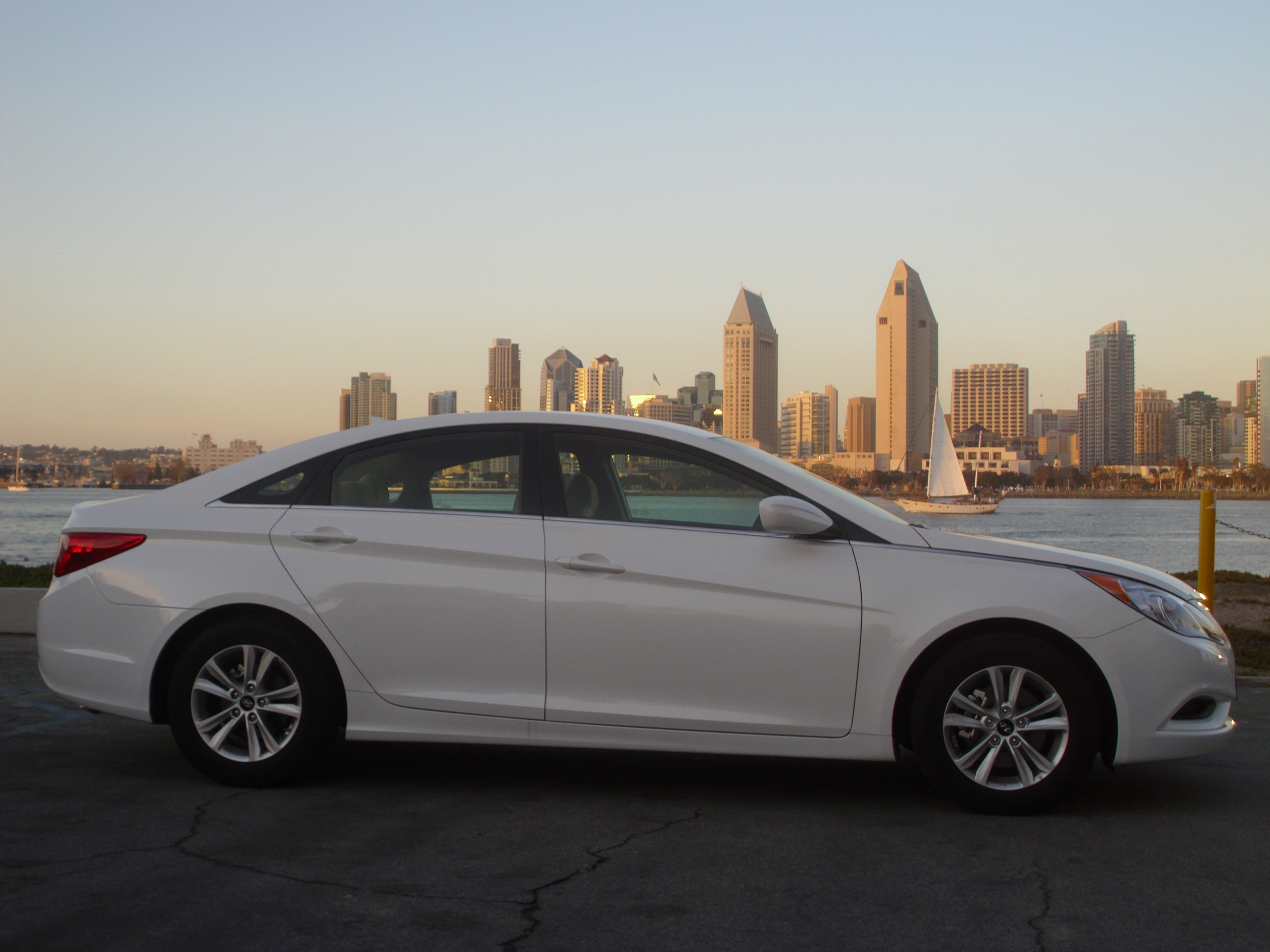 computer, Bluetooth and a six-speaker sound system with a CD player, satellite radio, an iPod/USB audio interface and an auxiliary audio jack. Our test car had no options and once the destination was added the total MSRP on our shimmering white Sonata was $21,790. For a base model, it didn’t feel spartan or bargain basement. A comparably equipped Camry would be over $23,000 and satellite radio is only available on the EX-L trim on the Accord, which pushes it up to $27,995. Throw in Hyundai’s infamous 10 year powertrain warranty and the Sonata comes across as a stellar deal.