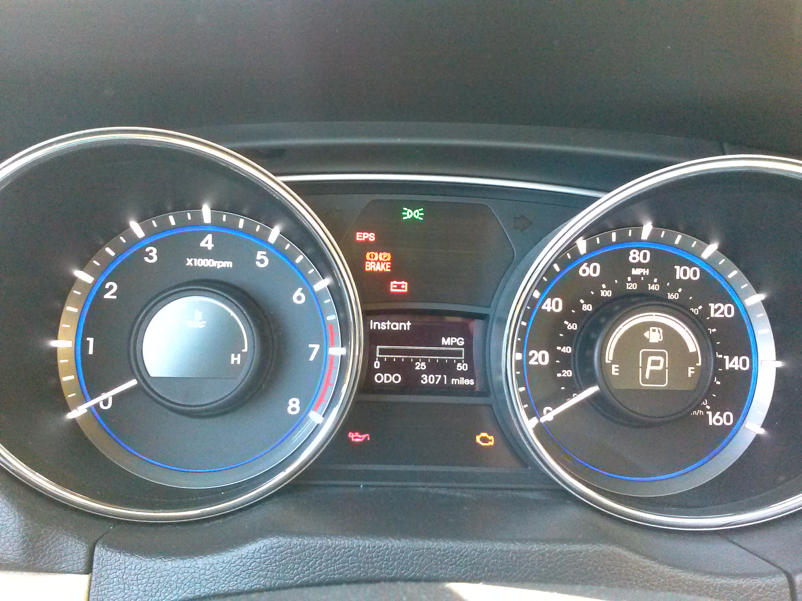 Gauges are crisp and easy to read and the center info display between the pods informs the driver of fuel economy and other stats. It also puts on a nice welcoming presentation during the start-up of the car. The steering tilts and telescopes and has intuitive buttons for the cruise and audio that also light up at night. It seems like Hyundai does pay attention to the little details like this- the