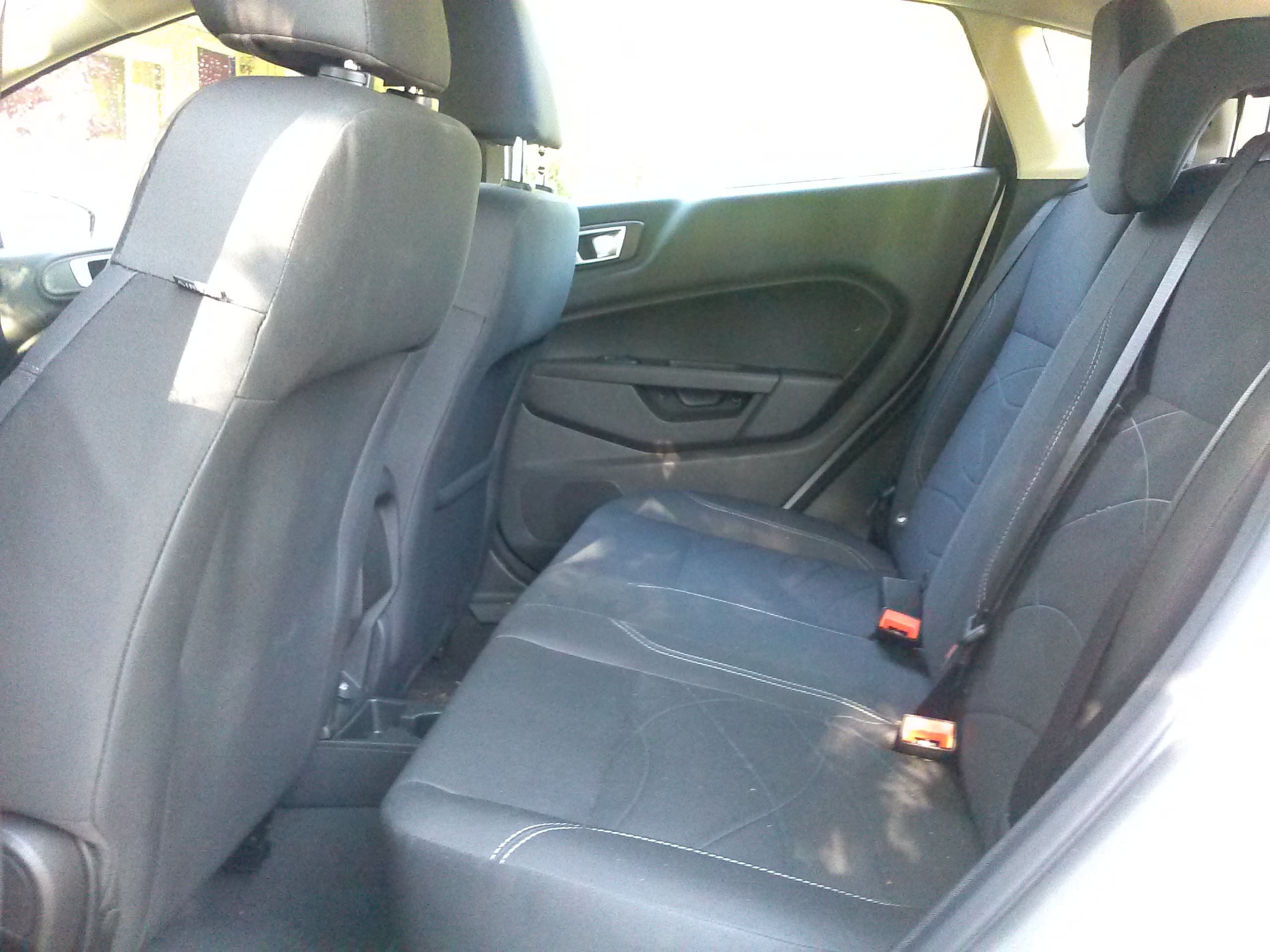 One aspect of being a subcompact that the Fiesta can’t escape is its small dimensions. Although slightly shorter in length than the Fit and Accent by a matter of two inches, the Fiesta feels like it’s had several feet lopped off. Up front, the story isn’t too dire. Headroom is pretty decent and the driver’s seat has height adjust; something that can’t be taken for granted in this price range. Leg room is moderate, although front passenger knees will barely clear the dash. The driver may find their left leg rubbing against the cupholder that’s molded into the door panel. Unlike the larger Focus, the center console isn’t too wide and doesn’t infringe as much on precious space for legs. Strangely, the Fiesta doesn’t feel as claustrophobic up front as its big brother. Front seats are comfortable for short trips, but there is too much lumbar support that jabs into backs during longer trips. I continually found myself searching for a knob or lever to decrease the lumbar but had no such luck. Lastly, Ford was kind enough to place some cloth padding on the armrest of the hard plastic-trimmed door panel, which in effect works, but the back edge of the armrest is too short and can rub against elbows where bone and hard plastic meet.