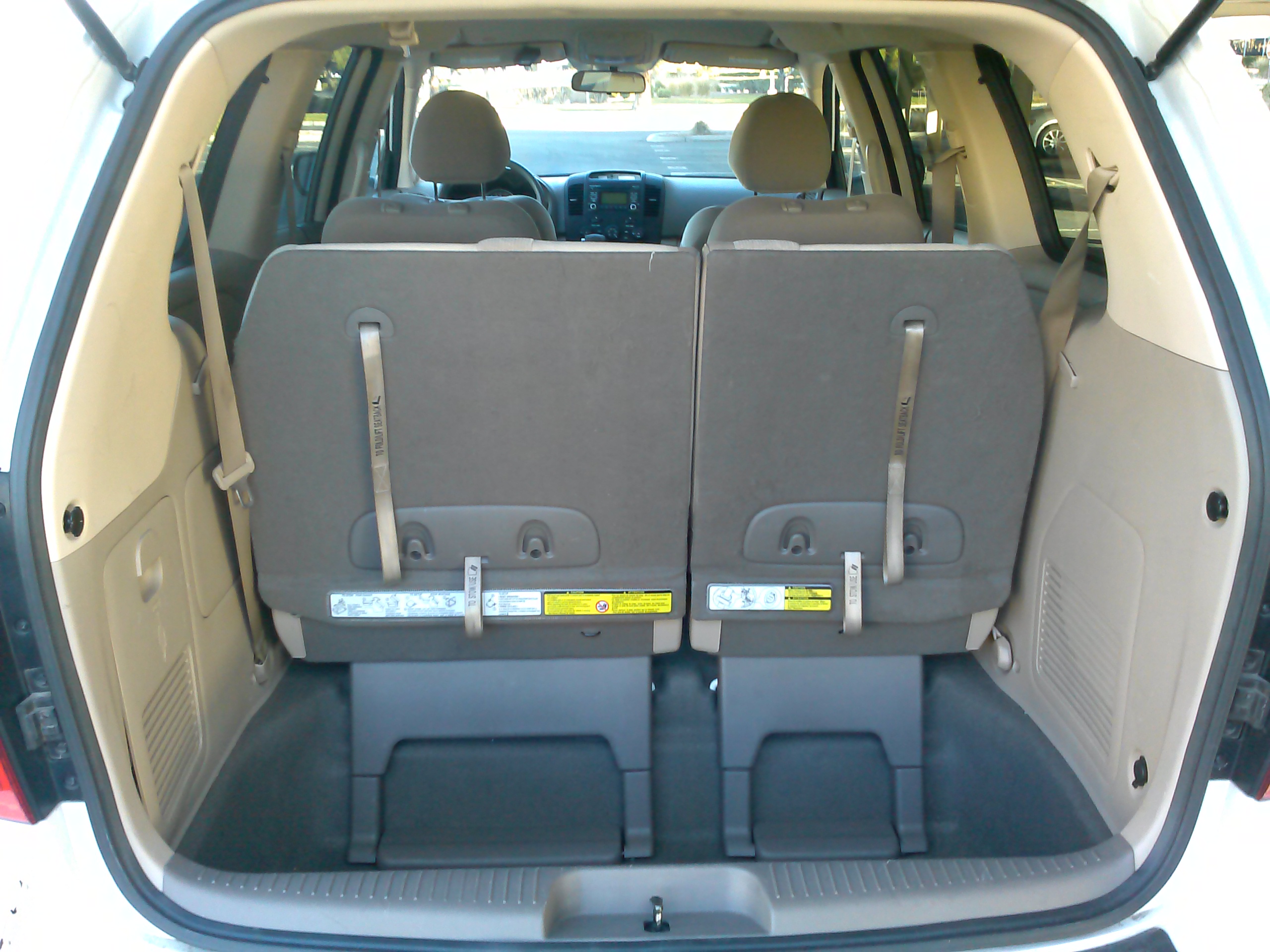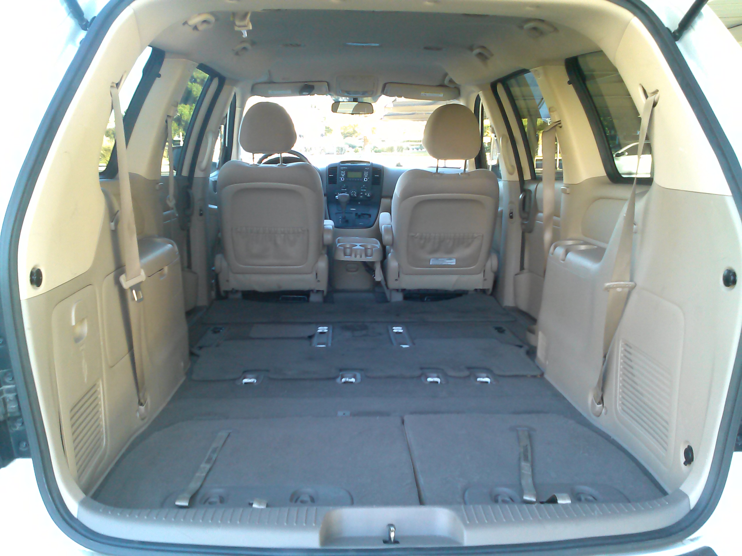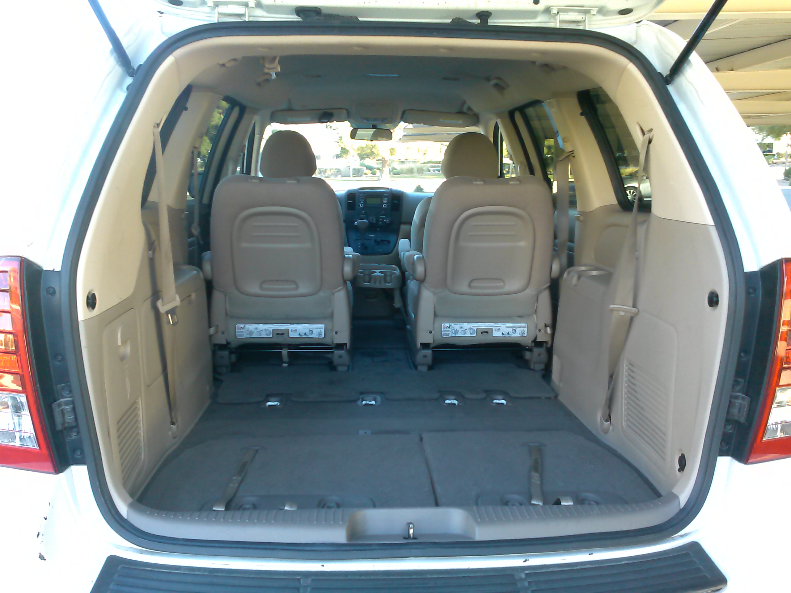 still is a little less than the other minivans (143.8 in the Caravan, 148.5 in the Odyssey, and 150 in the Sienna). It’s too close without a tape measure to see the difference, and there is still plenty of space for the Sedona to double as a pickup for large items and furniture. The hatch opening is large and liftover is low, making loading bulky items easy. Like many other vans, the Sedona has a plastic guard over the rear bumper to prevent scratches in the paint.