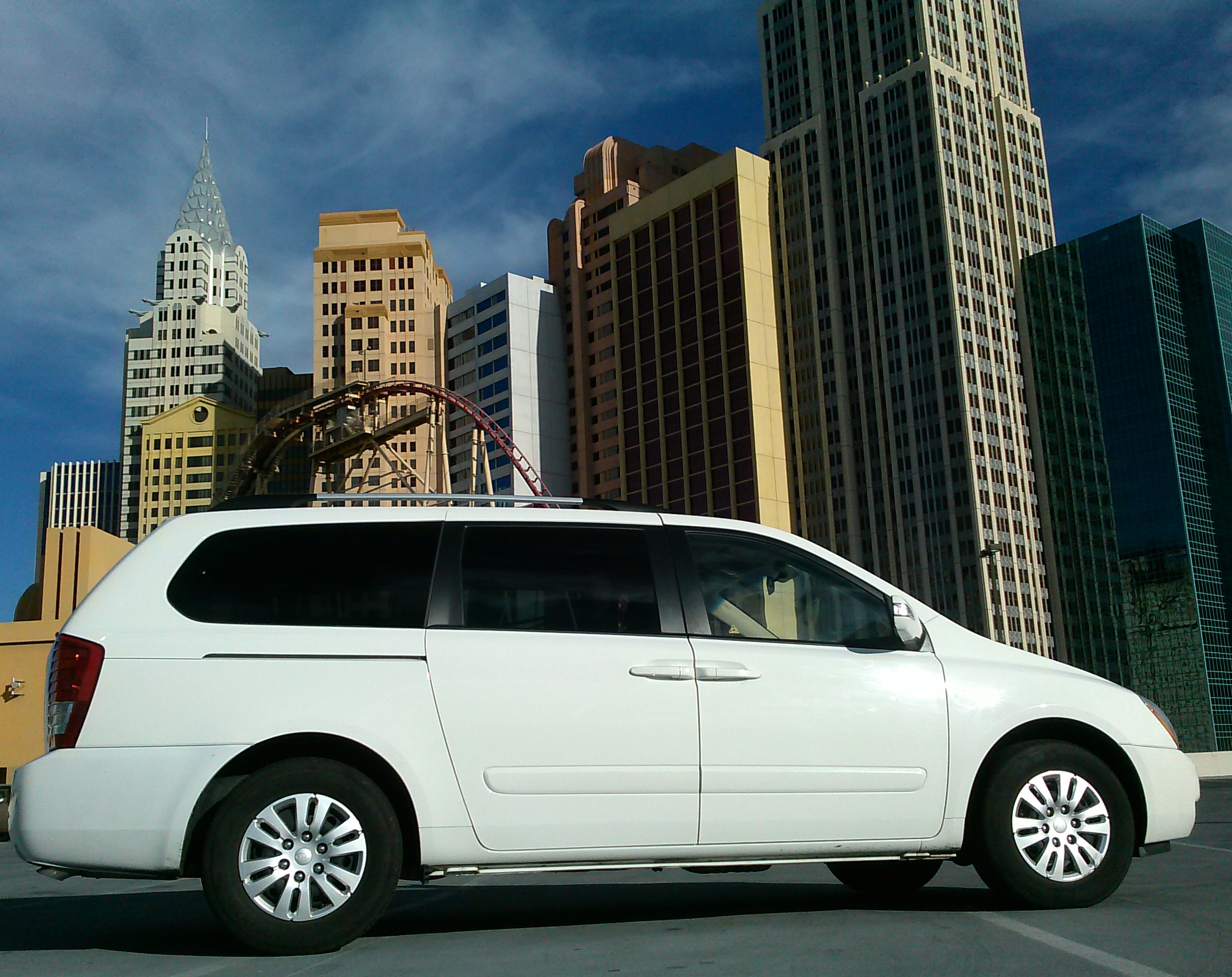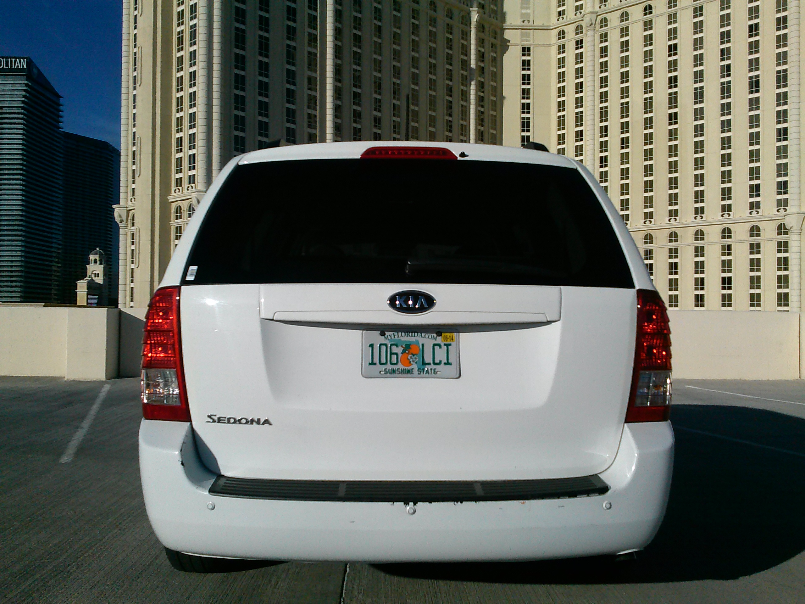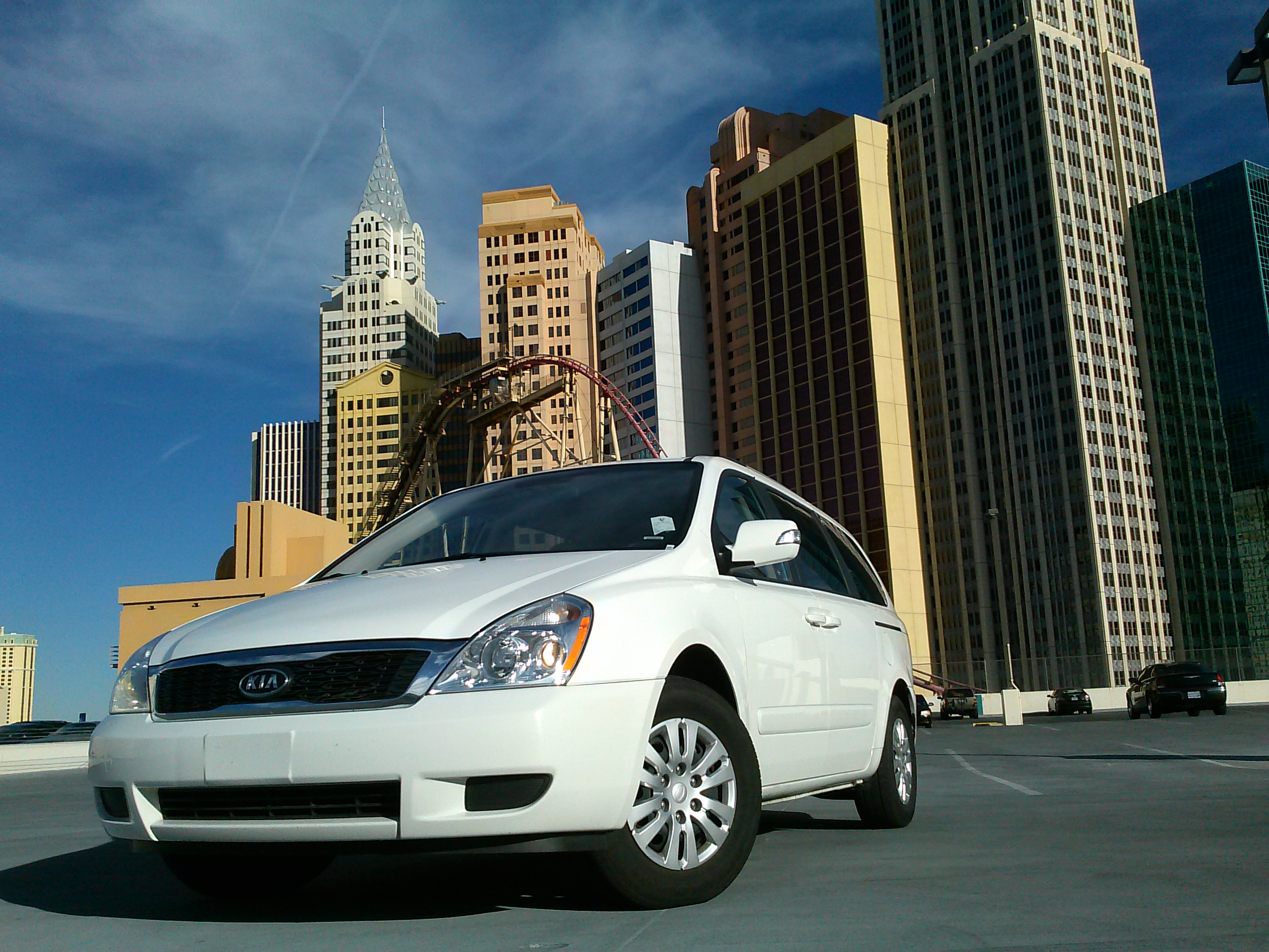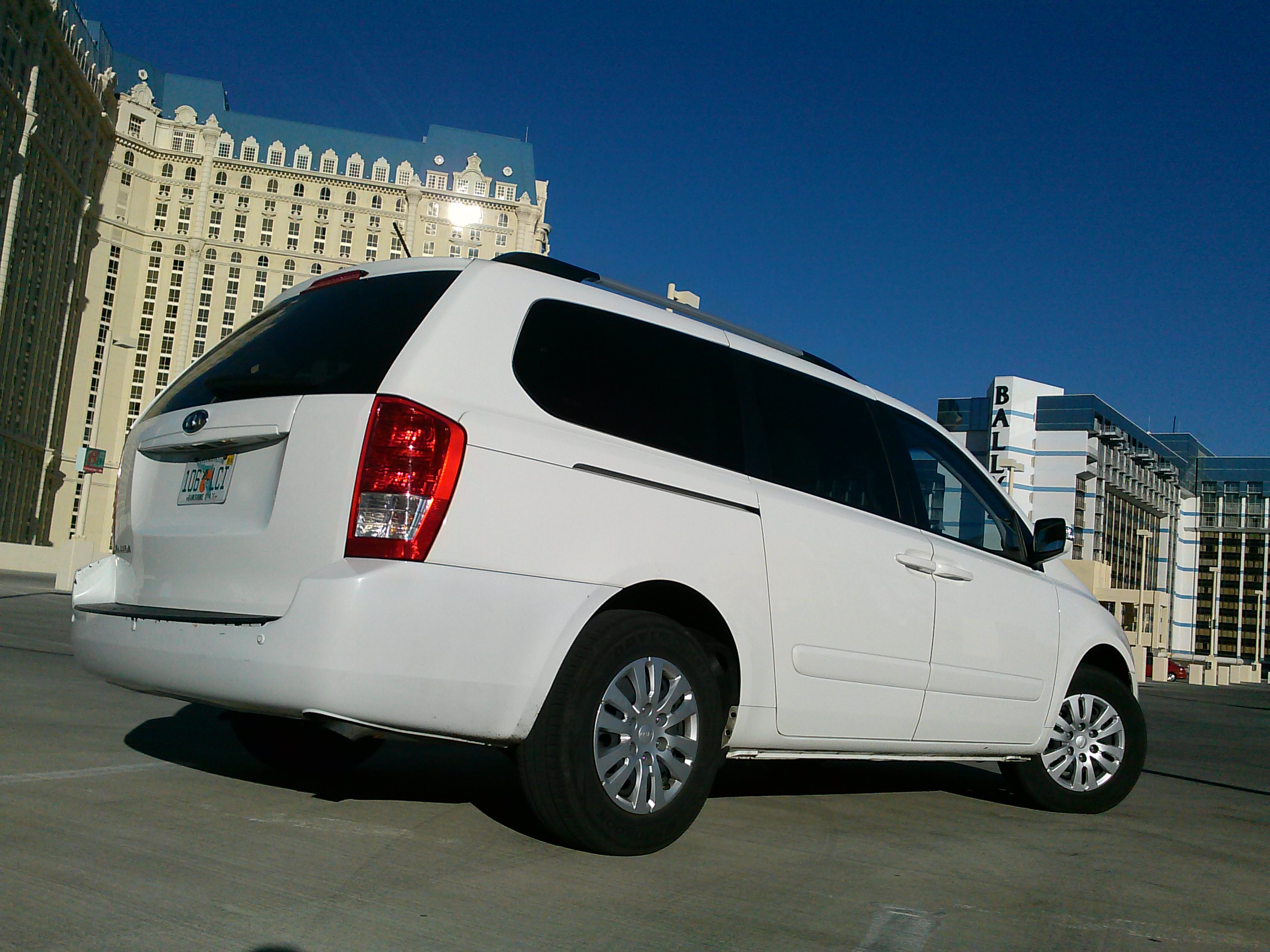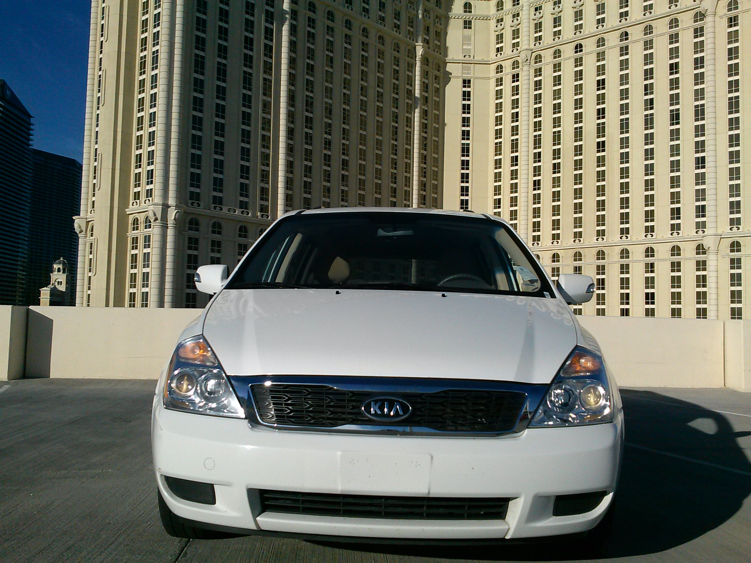 box shape of a van look interesting. I had to remind myself how invisible I probably appeared to most other drivers or pedestrians; there’s nothing about a white van that screams “crazy” or “dangerous”, especially on the eccentric Vegas Strip. However, I do find the Sedona to be handsome and did like the chunky, square-edged look of the rear, and the front’s triangular headlights still loo