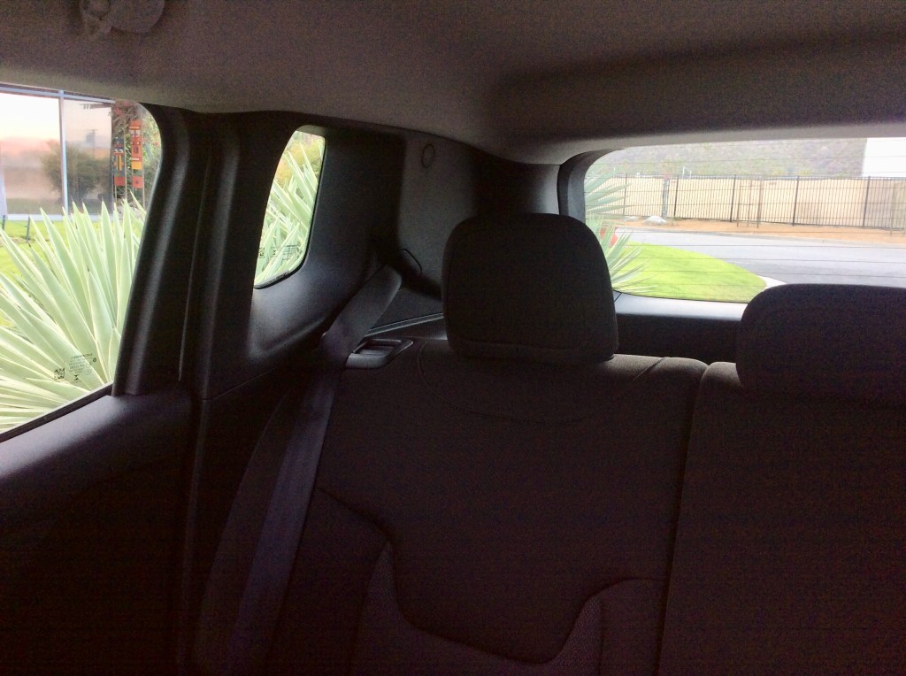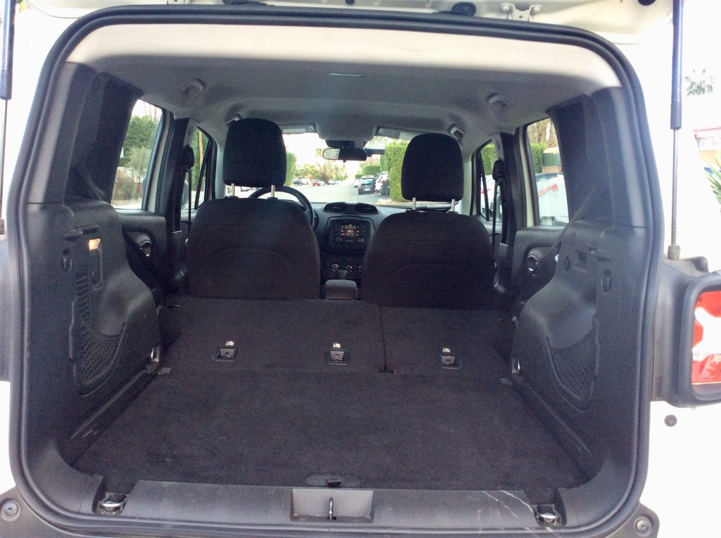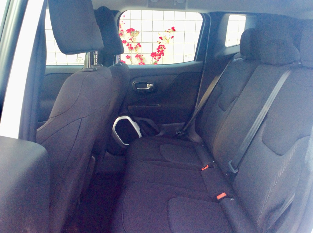 Rear seats are on the tight side. The seatbacks are upright and do not recline. Headroom is generous thanks to the tall, squared-off roofline. Most passengers will find their knees digging into the front seats. Luckily, in an age when many seatbacks are clad in hard plastic, the Renegade’s are cloaked in a soft cloth that offers some give for the passenger’s legs. What they will not find in the rear are seatback pockets; an odd omission that couldn’t have saved Jeep that much money.