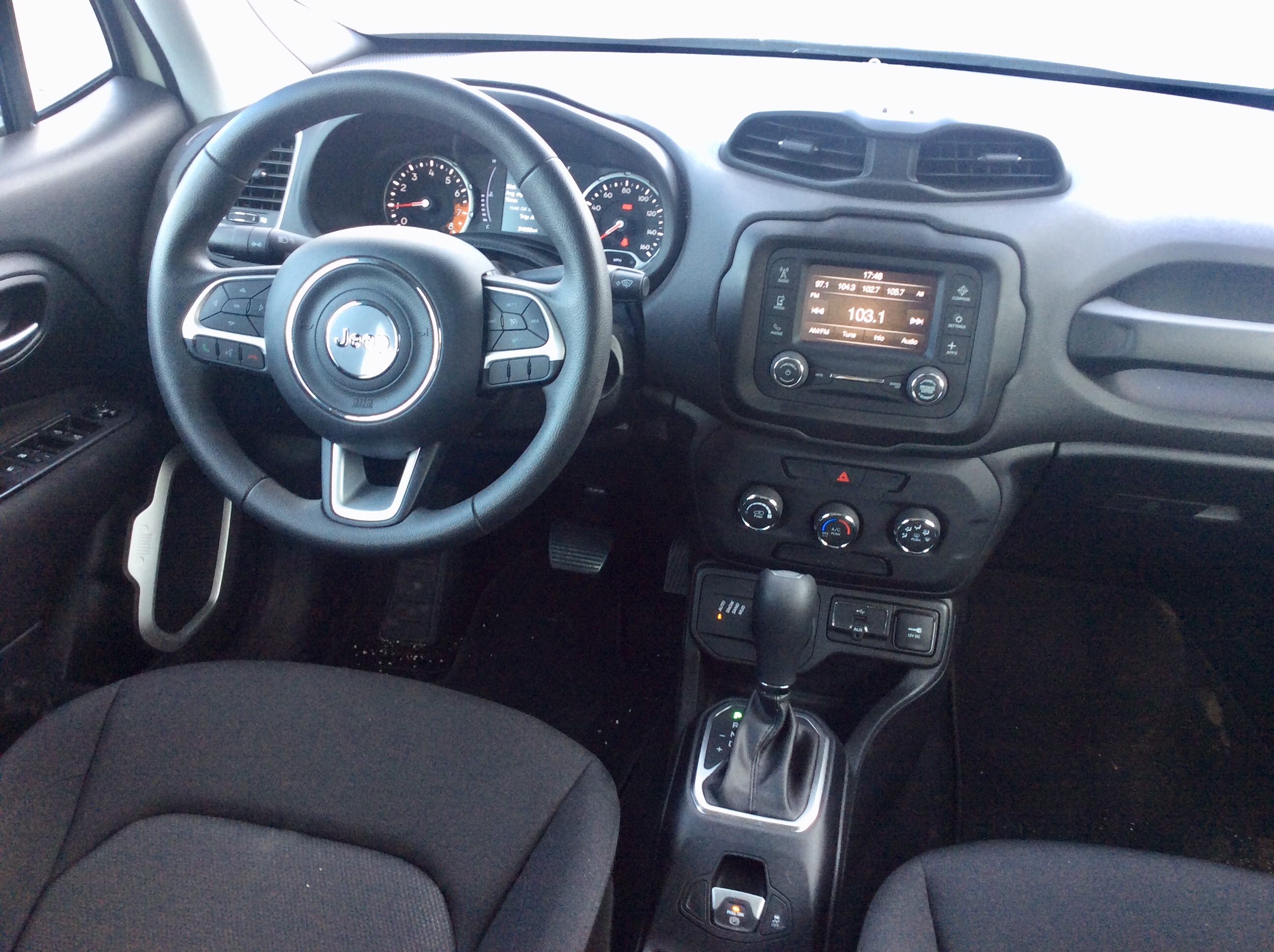 Prices on the Renegade start at $18,445. The MSRP’s are tempting, but these are lightly optioned cars that have a manual transmission and no air conditioning. However, standard equipment still includes: 16-inch steel wheels, manually adjustable mirrors, remote locking and unlocking, push-button ignition, power windows and locks, a rearview camera, a height-adjustable driver seat, a fold-flat front passenger seat, a 60/40-split folding rear seat, cloth upholstery, a removable cargo floor panel, a tilt-and-telescoping steering wheel, a driver information display, Bluetooth, a 5-inch touchscreen, and a six-speaker sound system with a USB port. We included the $1,495 Power and Air Group that adds such delicious goodies as air conditioning, cruise control, and heated, power side mirrors. Going for the automatic transmission is free, but must include the 2.4 litre engine, an added $1,330. Once destination charge was added, our alpine white Renegade had a sticker price of $24,215.