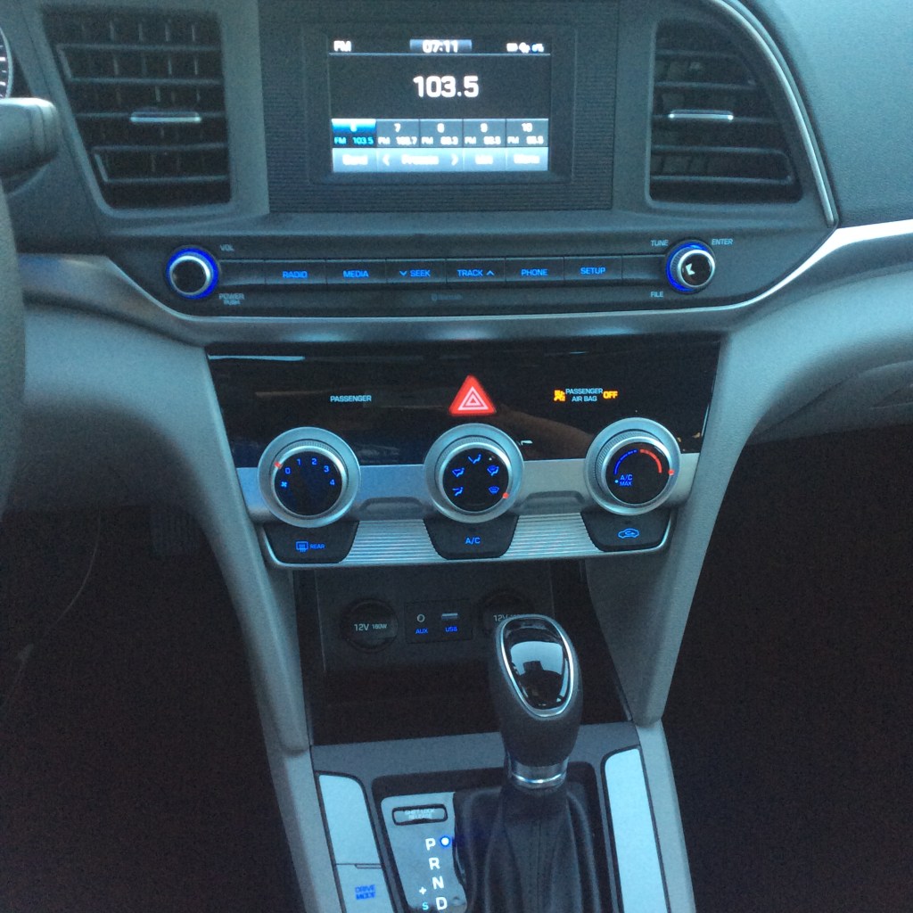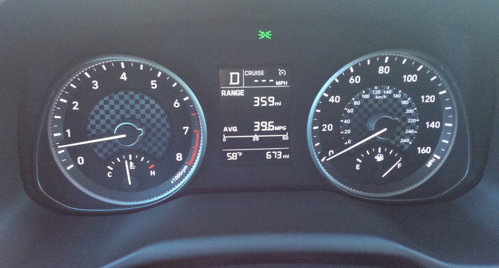 At first glance, there’s not much different from last year. But look closer. Three large, extremely simple ventilation knobs, each flanked by a control button mimicking a toggle switch, replace the profusion of buttons in last year’s Elantra. The instrument surround has also been revised and is now more of a pod that juts out, and the instruments themselves have been redone. The gauges, in true Hyundai fashion, are clear, legible to read, and have a cool, racy checkered pattern in the background. The edgier steering wheel is lifted straight from the Ioniq. Material quality has improved as well.