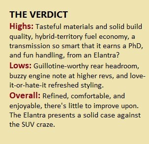 The transmission makes a perfect companion to the sprightly engine. There’s several choices on the Elantra smorgasbord, including a six-speed manual and advanced seven-speed dual-clutch automatic, but our tester settled on the plain, jane six-speed automatic that is on lower trims. It’s a slick unit with well-controlled and properly timed shifts that are almost transparent. It always seemed to know the right gear ratio to be in, and was willing and eager to downshift whenever needed for passing or hills. Never once during several hundred miles of driving did it falter or get overwhelmed.