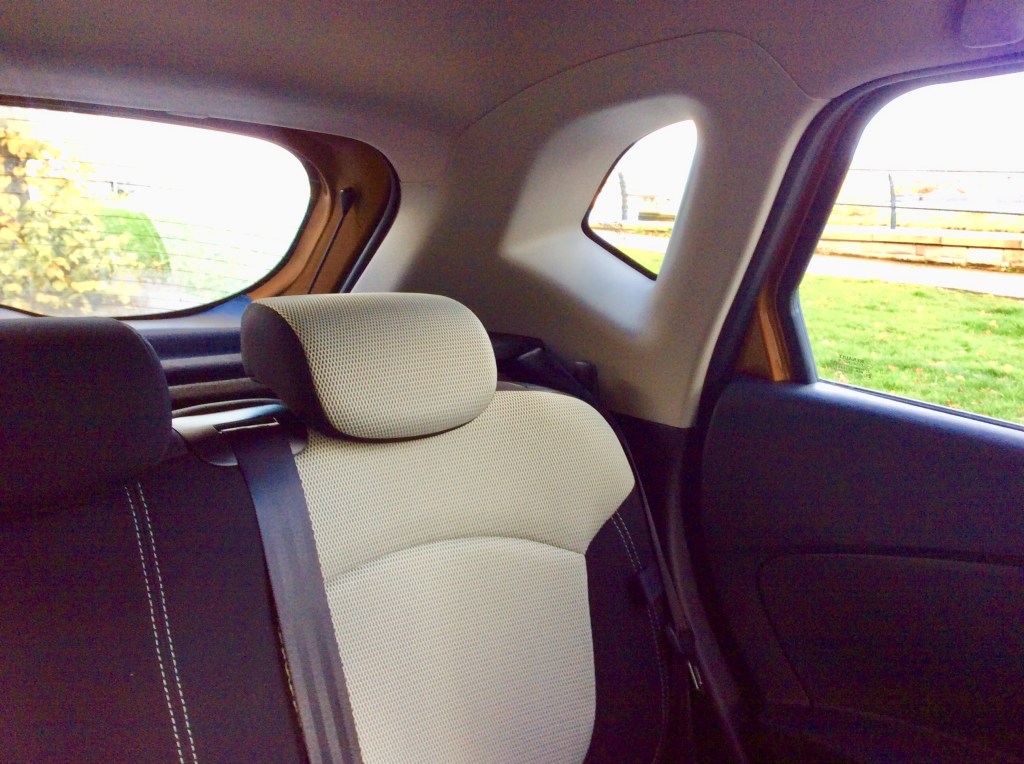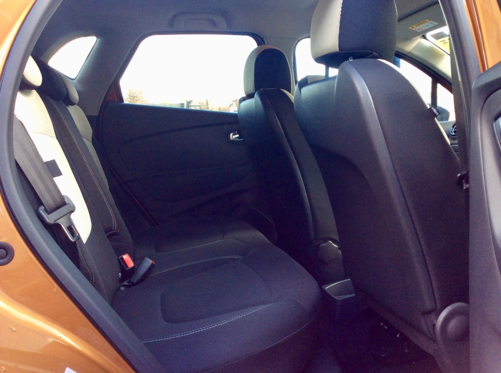 Although the Captur claims to be an SUV, there’s no escaping its diminutive footprint in the back seat. Legroom is tight in a subcompact sense, and the front seatbacks are hard plastic with no give for knees. Some negotiating would be required with front passengers to scoot forward. Surprisingly, the headliner also dips down into airspace that taller heads encompass. The seats are cloaked in the same durable, attractive two-tone fabric as the front. Entering and exit can be tricky due to the narrow door openings that won’t accept large feet . Two full size adults can ride in the back of a Captur, but won’t be happy on longer trips. Three would be unhappy before leaving the driveway.