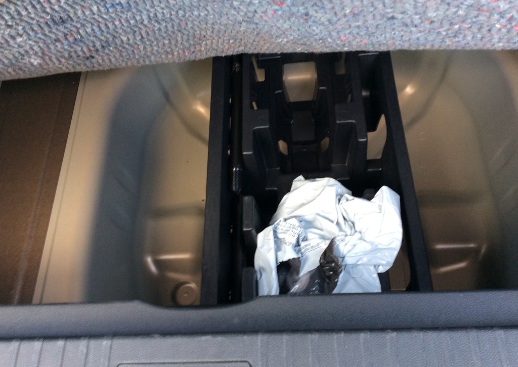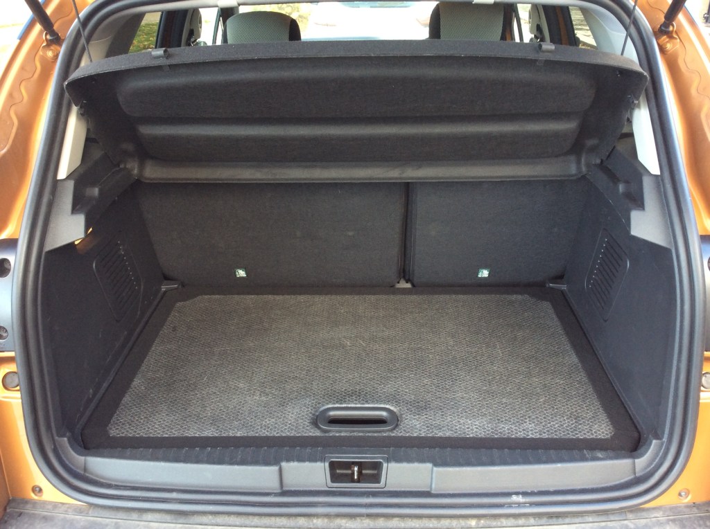 Where the Captur shines is cargo flexibility. With the seats in their upright position, there’s 14.9 cubic feet of volume. Those numbers are paltry compared to the competition but don’t tell the whole story. The trunk itself is squared off and has a purposeful shape that’ll easily gobble a suitcase and several large bags. The rear seats also have a nifty trick and, utilizing an industrial-grade handle, can roll forward on a track by about six inches. The eliminates any legroom in the back seat, but adds an additional 4 cubic feet. Or the rear seats can fold in the traditional manner 60/40 split, revealing a more impressive total of 43.6 cubic feet. The seats do fold completely flush with the cargo floor and loading is easy thanks to a wide opening and minimal liftover. That cargo floor can also be removed, revealing additional space, or double as a cover for the secret compartment below. Underneath that compartment is a wheelwell for the spare tyre, but it’s optional. Our Captur only came with the reticent inflator kit.