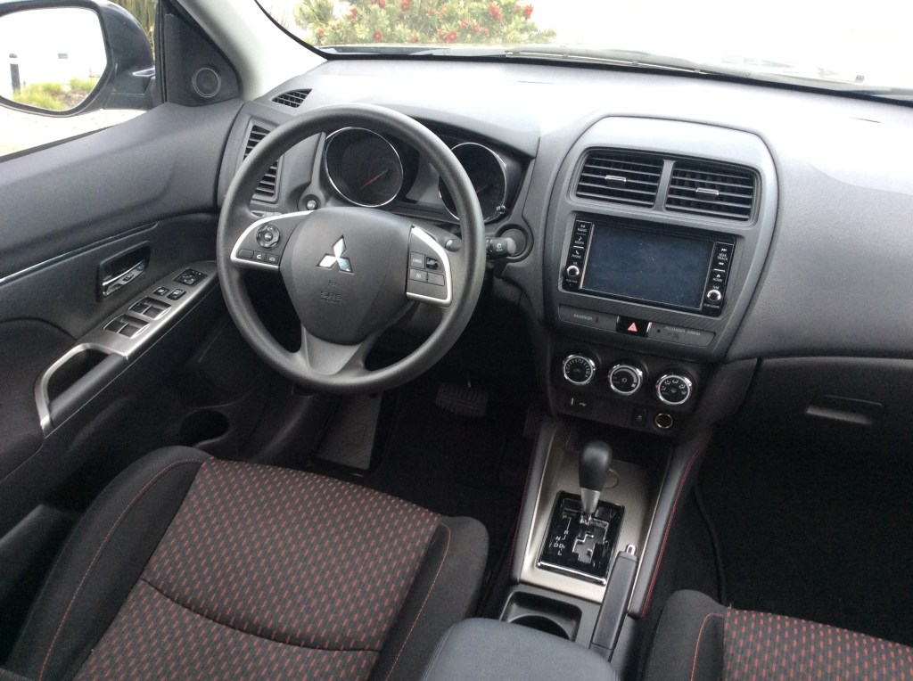 Inside, the age of the design shines through. The basic shapes look fine, being minimalist and utilitarian. But the materials used are penny pinched with massive expanses of soulless, black plastic. There’s nothing inspiring and it’s as dreary as Gotham City to spend time in. Mitsubishi tried to liven the mood up with little sprinklings of fake chrome trim on the door panels, steering wheel and console. It’s not convincing. Around the centre air vents is an equally chintzy plastic trim haphazardly imitating carbon fiber. An extensive plethora of grey switch blanks just adds to the somberness and serve as a reminder that we settled on the base ES trim. The overall presentation is unimaginative, but doesn’t offend either and feels solidly constructed.