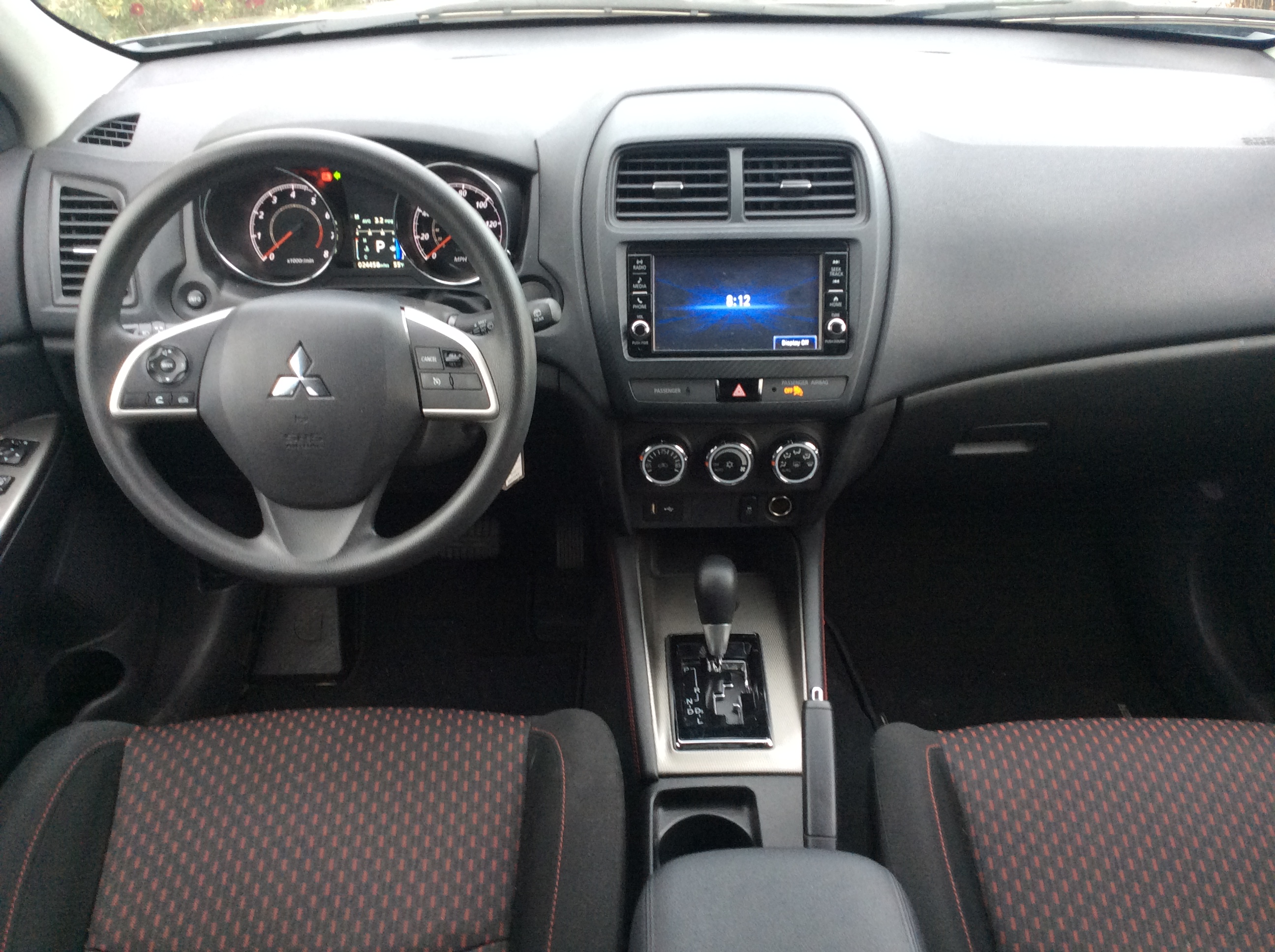Interior space is an Outlander Sport strong suit, especially considering its tidy 171.9 inch length. In size, the Sport is a “tweener”; larger than the Hyundai Kona, Mazda CX-3, or Kia Soul that are competitive in price, but smaller than the benchmarks in this class like the Toyota RAV4 or Honda CR-V. The front seats offer plenty of headroom and legroom. There’s enough space in the footwheels for folks over 6 foot tall to completely stretch out. Both front seats are adequately shaped and proved to be comfortable on long drives, although the flat seat bottoms felt hard, causing numbness in the bum after a few hours. The sporting side bolstering and red stitching on the seats added some desperately-needed flair. The driver seat has height adjustment, but the Sport already had an almost-trucklike commanding view of the road and finding a comfortable driving position wasn’t difficult. Thanks to an abundant glass area, thin roof pillars, and large side mirrors, visibility is excellent all-around.