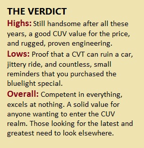 Once up to cruising speed, the Sport is pleasant. Wind, road, and engine noise is subdued and the CUV tracks fine down the highway. The suspension is a traditional setup with MacPherson struts up front and a multi-link arrangement in the back, along with stabilizer bars on both axles. The ride is on the stiff side, in the European sense, and road imperfections make their presence known. On rough pavement, the Sport can get jittery. Although the Sport is unibody, there is a truckish body-on-frame feel and it doesn’t pamper its passengers.