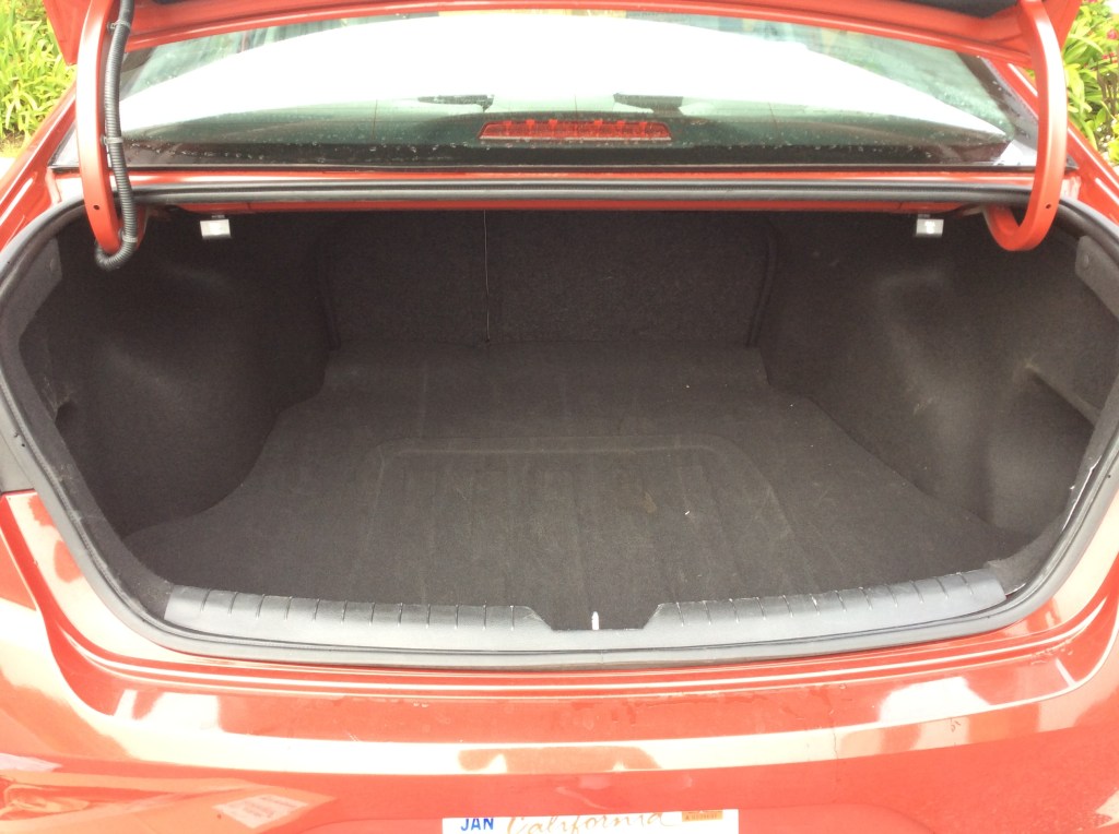 If more storage is needed, the trunk volume is above average in this class measuring 16.3 cu. feet. That beats the Toyota Camry, Nissan Altima, and Ford Fusion, but falls slightly behind the crafty Honda Accord. The cargo area is a usable shape with minimal wheel intrusion and can easily swallow several suitcases. Although not upscale, the trunk lining seems durable and [finally] hides a spare tyre below (it was added in 2016). The opening is wide and low, resulting in easy loading. However, that short, stylish decklid doesn’t give the opening much depth. The back seats do fold 60/40, yet like I noted with the 2013 Sonata, the tiny pass-through is unproportionate compared to the substantial capacity of the trunk. The Hyundai badge on the decklid has a neat party trick and doubles as a button for access. One oversight is the omission of an inside assist grip to close the boot, resulting in dirty fingers and hand prints imitating Jack Dawson’s on the back of the car.