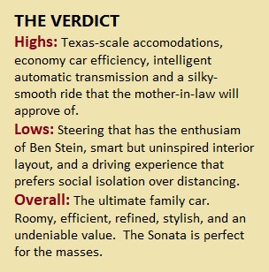 Steering is the greatest performance downfall, and it’s an ongoing trait. Back in 2013, I wrote that the Sonata’s road feel was “comatose” and had the feedback of “soggy English teabags.” Things have improved, and the electric steering is effortlessly light in parking lots making it easy to park. The resistance through the wheel tightens up as speeds increase. There’s still not enough communication through the wheel to encourage spirited driving and the dead on-centre feel on the highway remains. Yet again, few Sonata drivers will be so discerning or care.